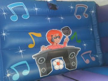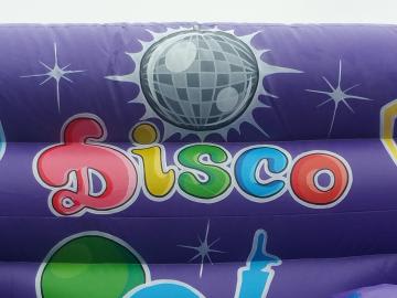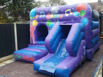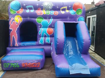 Disco Castle with Slide on the front! A great all in-one castle! A twist on the standard slide bouncy castle - You get a the best party in town - bounce in the castle Disco, listen to the music on the Bluetooth Speakers, and slide out with style! Ideal for a Summer Disco Party with your friends. Adults can have fun too!