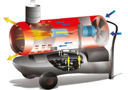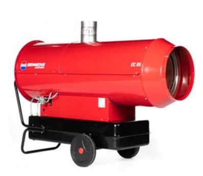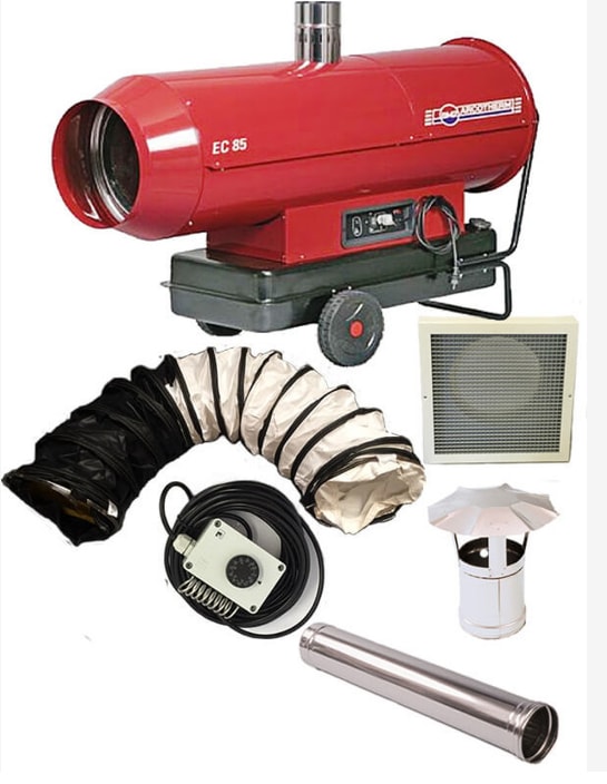 This industrial space heater offers a heat output of 80 kW, with an airflow rate of 4300 cubic meters/ hr and 105 litre tank. It features an AISI stainless steel combustion chamber, automatic built in oil burner and a Danfoss pump, electronic flame control, safety thermostat and electronic control panel.