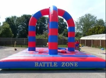 Wrecking Ball & Gladiator Duel Combined! Battle Zone - Stand on the four podium blocks and try to knock your opponent off with the wrecking ball! Gladiator - Stand on the four podium blocks and use your pugil sticks to knock your opponent down!