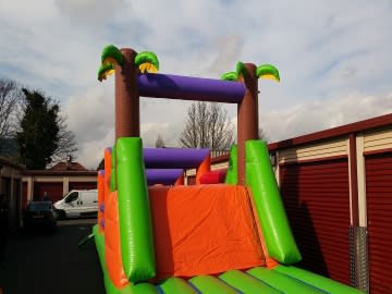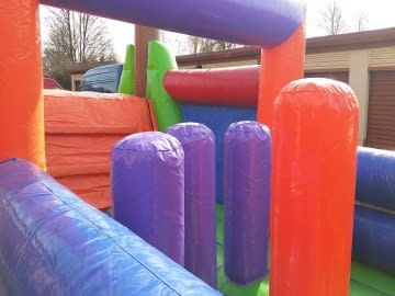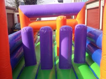A GIANT Obstacle course ideal for any party or event! To complete this obstacle course you and a friend must run through the twin crawl through tunnels, fight your way through the bish bash section with 5 pillars, get through the up and over squeeze through area, before climbing up the mini steps and finally down the slide! A sure hit to keep both the kids and adults entertained as they compete with their friends to see who can get through first! A very popular obstacle course ideal for indoors or outdoors.